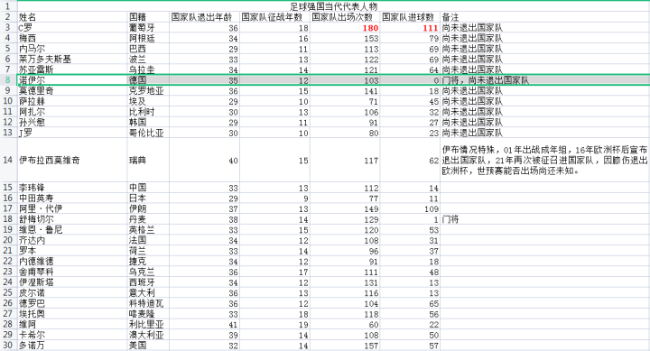 从这个表可以看出,各国代表球星,这之中大部分在世界足坛都是或者将是传奇巨星。除了门将球星寿命偏长,36-40,平均值算作38,其他位置的球星国家队平均退出年龄在33-36岁之间,普遍的服役年份在12-14年之间。