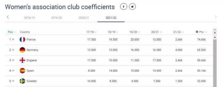 从UEFA官网的积分统计可以看出,欧洲女足有「四大联赛」:法国、德国、英格兰、西班牙——排名第五的瑞典联赛,与前四名的距离则较为明显。
