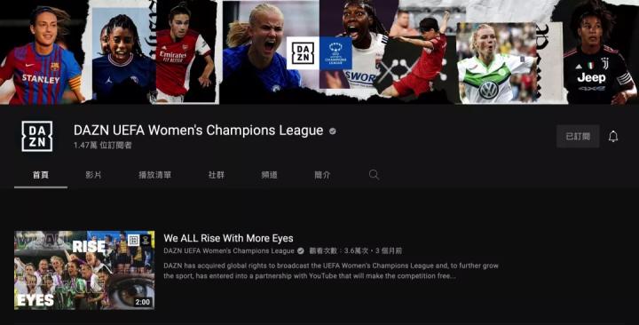 不过,我们很高兴的看到,已经有越来越多的转播平台开始重视起了女子体育市场——例如新赛季的女足欧冠转播平台,就是知名的体育付费流媒体服务平台(OTT)DAZN。
