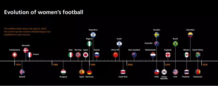 目前的顶级女子足球联赛在每个国家成立的年份演变历程