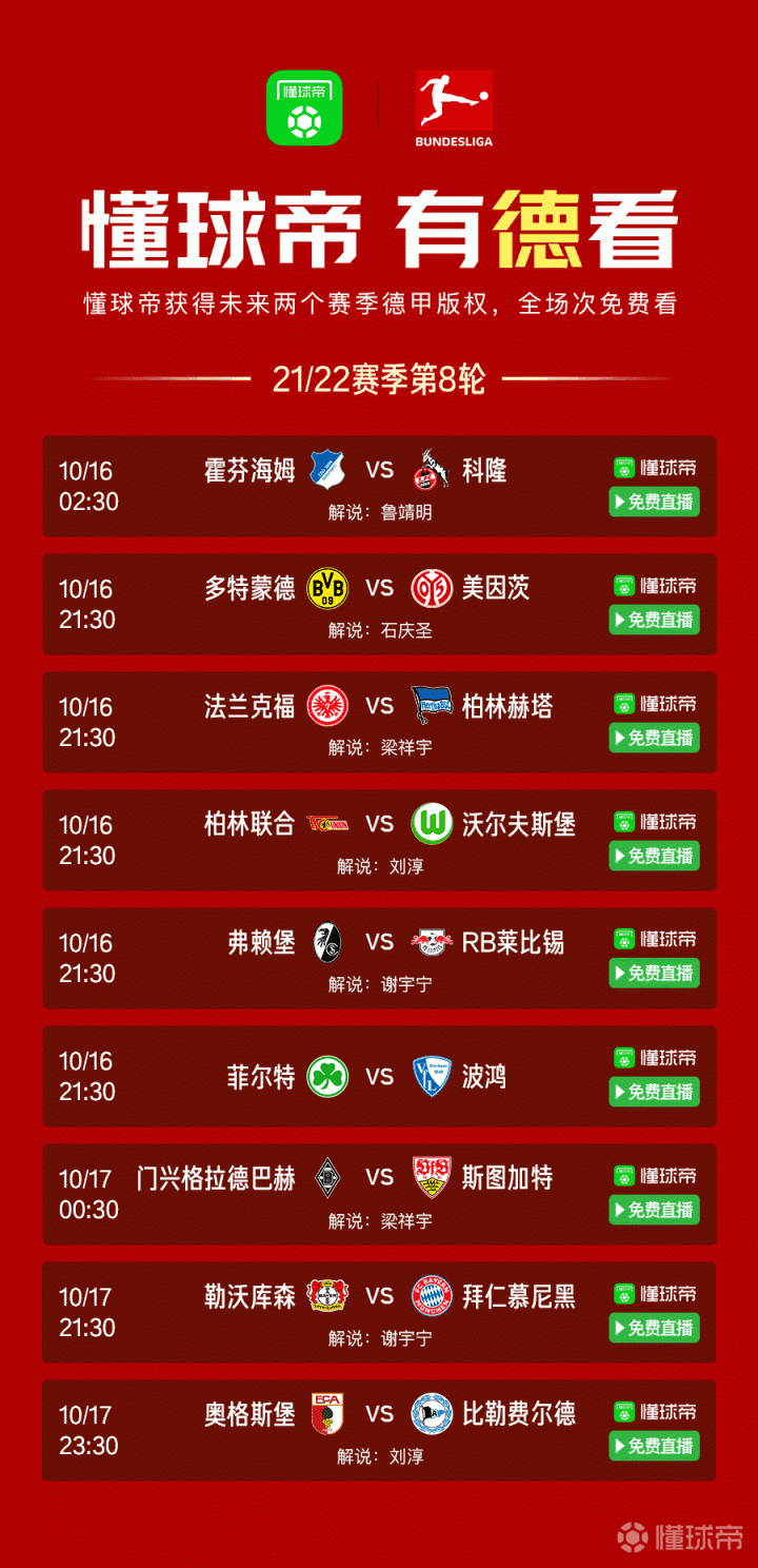 随着国际比赛日的结束,五大联赛战火重燃。懂球帝将继续为大家带来德甲联赛全场次视频直播,@足球解说-石庆圣 、@梁祥宇 、@足球解说员刘淳 、@谢宇宁 将在21:30分别对多特蒙德vs美因茨、法兰克福vs柏林赫塔、柏林联合vs沃尔夫斯堡、弗赖堡vs莱比锡进行解说评述,@梁祥宇 还将在凌晨00:30带来门兴vs斯图加特的解说评述。