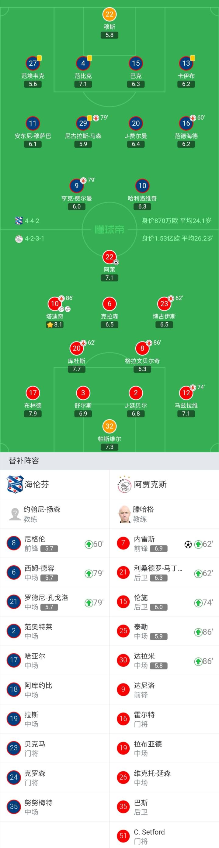 海伦芬首发:22-穆斯、27-范埃韦克、4-范比克、15-巴克、13-卡伊布、29-尼古拉斯-马森(79'21-罗德尼-孔戈洛)、10-哈利洛维奇、20-J-费尔曼、11-安东尼-穆萨巴、9-亨克-费尔曼(79'6-西姆-德容)、16-范德海德(60'8-尼格伦)