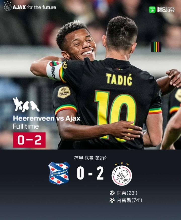 阿贾克斯客场2-0海伦芬,阿莱、内雷斯破门,塔迪奇助攻双响