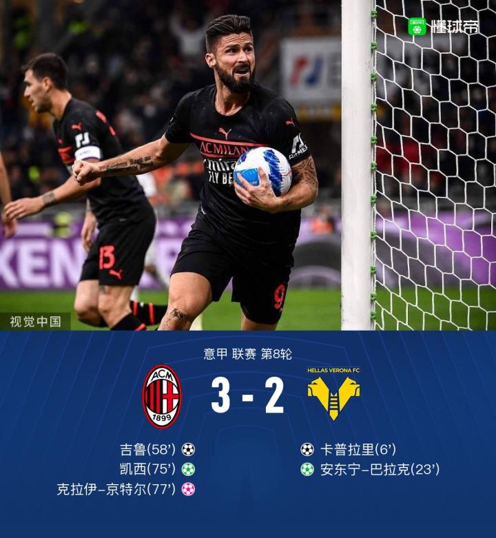 第59分钟,拉斐尔-莱奥左路传中,吉鲁头球破门,AC米兰1-2维罗纳!