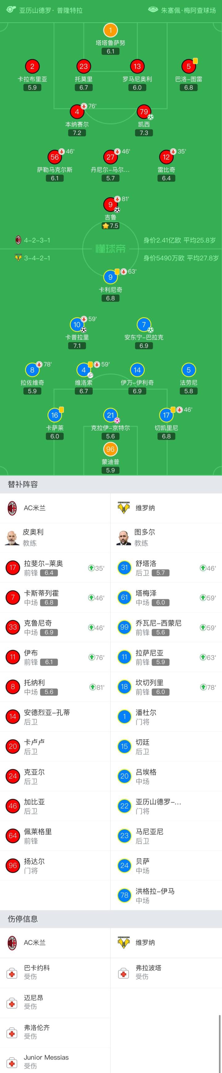 AC米兰首发:1-塔塔鲁萨努、2-卡拉布里亚、23-托莫里、13-罗马尼奥利、5-巴洛-图雷、79-凯西、4-本纳赛尔(77' 11-伊布)、56-萨勒马克尔斯(46' 7-卡斯蒂列霍)、27-丹尼尔-马尔蒂尼(46' 33-克鲁尼奇)、12-雷比奇(36' 17-拉斐尔-莱奥)、9-吉鲁(82' 8-托纳利);
