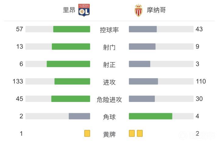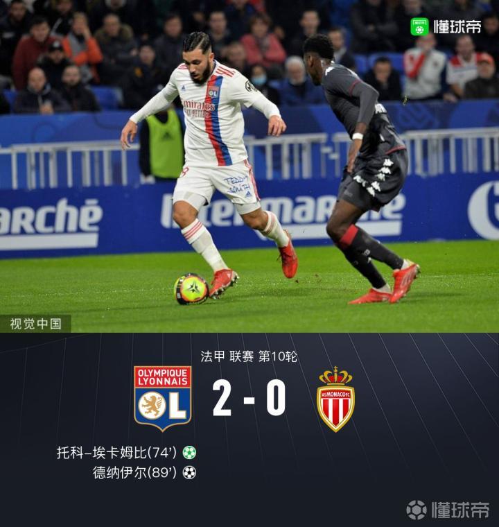 里昂2-0摩纳哥,托科-埃卡姆比点射,德纳伊尔建功