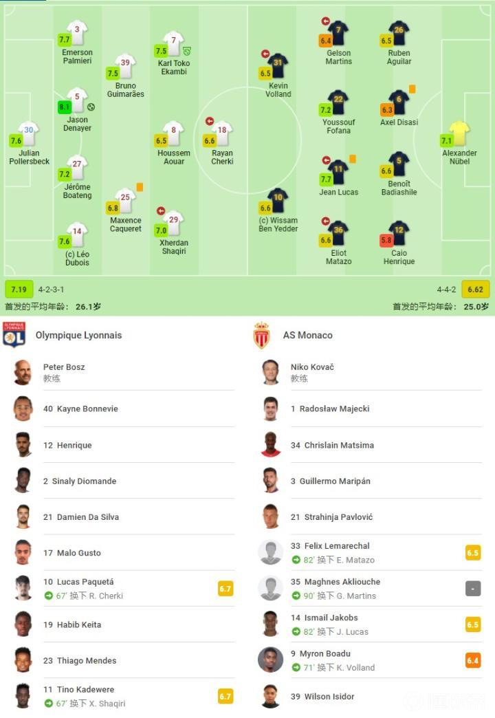 里昂首发:30-波勒斯贝克、14-迪布瓦、27-热罗姆-博阿滕、5-德纳伊尔、3-埃莫森、25-卡克雷、39-吉马良斯、29-沙奇里(67' 11-卡德维尔)、8-奥亚尔、7-托科-埃卡姆比、18-切尔基(67' 10-帕奎塔);