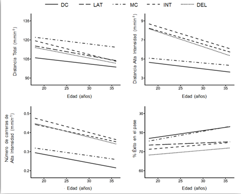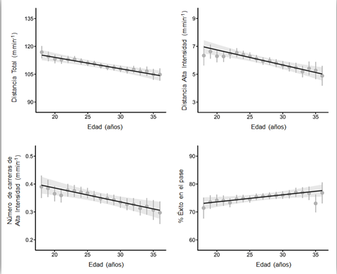 第一个数字显示了足球运动员覆盖的总距离是如何从他们年轻时达到的最高值每年减少0.56%的。高强度(>21.0 km/h)覆盖距离和高强度短跑次数每年分别减少1.80%和1.42%。然而,成功传球的百分比每年增加0.25%。