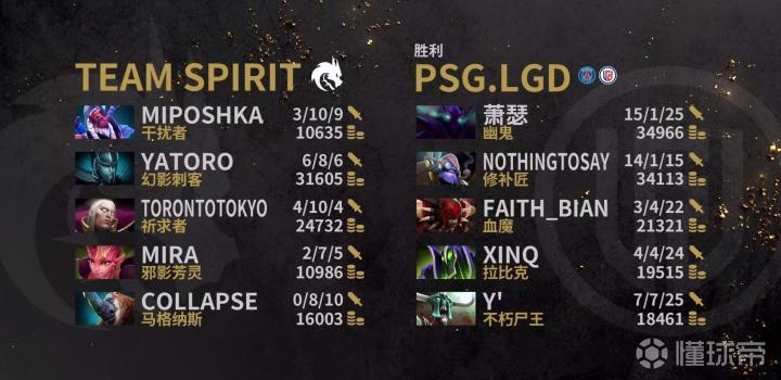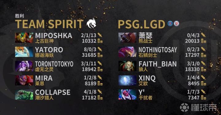 第一局Spirit选出团战阵容,Yatoro无解小娜迦带队。32分钟Spirit击杀小精灵控到二代盾,最终38分钟LGD高地防守失败打出GG,Spirit先下一城。