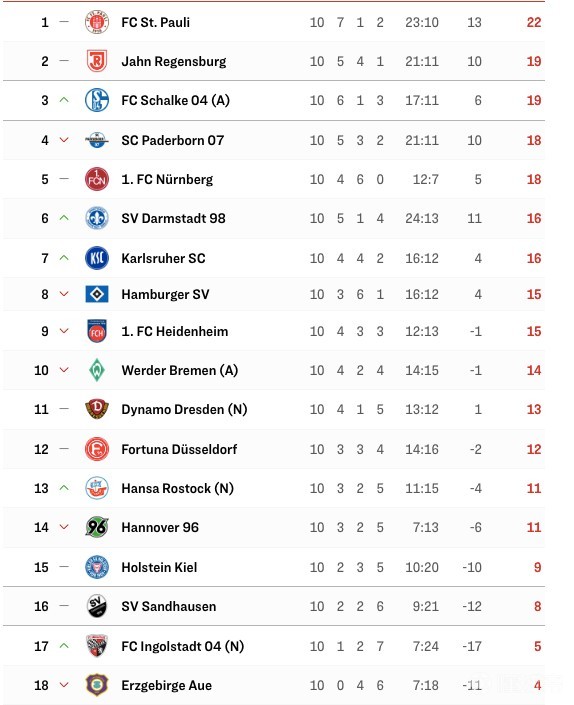德乙最新积分榜:沙尔克第三,汉堡、不莱梅分列第八和第十阿漂 @懂球帝2021-10-18 08:06北京时间10月17日,德乙第10轮的所有比赛都落下帷幕,其中不莱梅0-3负于达姆施塔特,暂时排名德乙第十位。另一支德国老牌球队汉堡本轮与杜塞尔多夫1-1战平,领先不莱梅1分,暂时排在积分榜第8位。目前领跑积分榜的三支球队为圣保利、雷根斯堡和沙尔克04,其中沙尔克与第二的雷根斯堡同积19分。展开更多