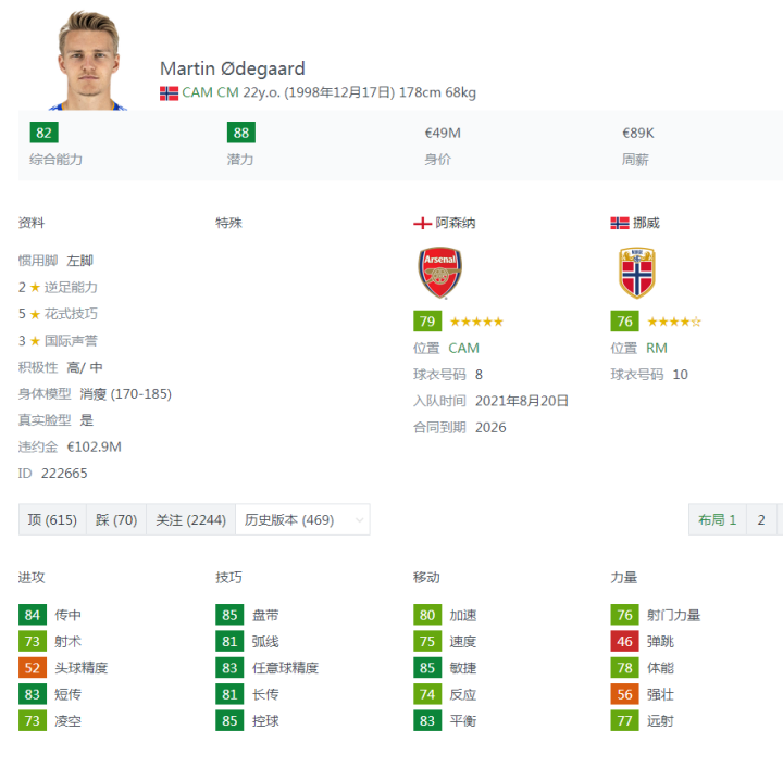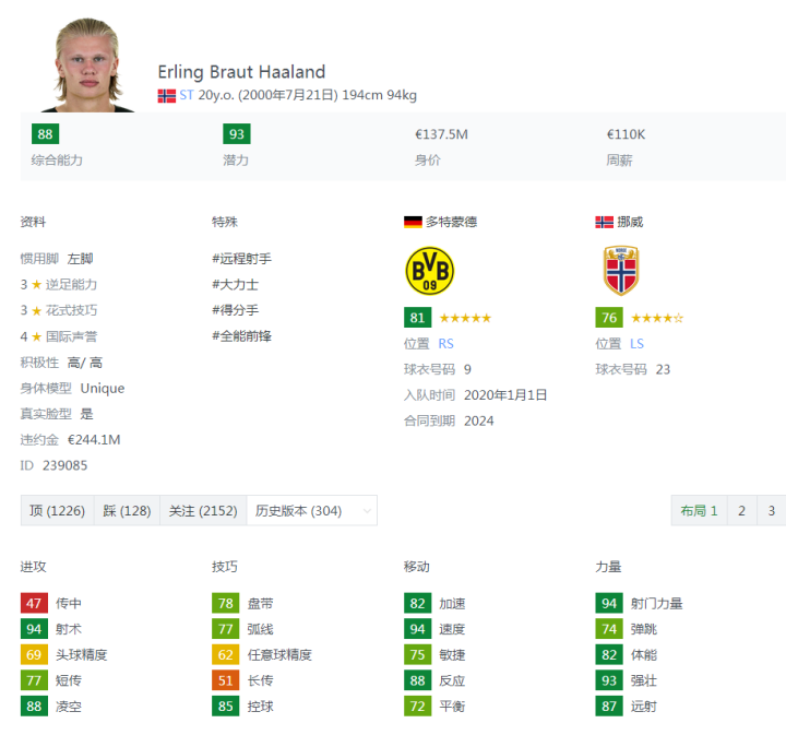 FIFA22的最新数据,哈兰德能力值88、潜力值93,厄德高能力值82、潜力值88,两人总能力值和潜力值分别为170和181。