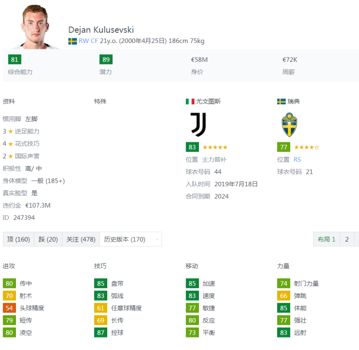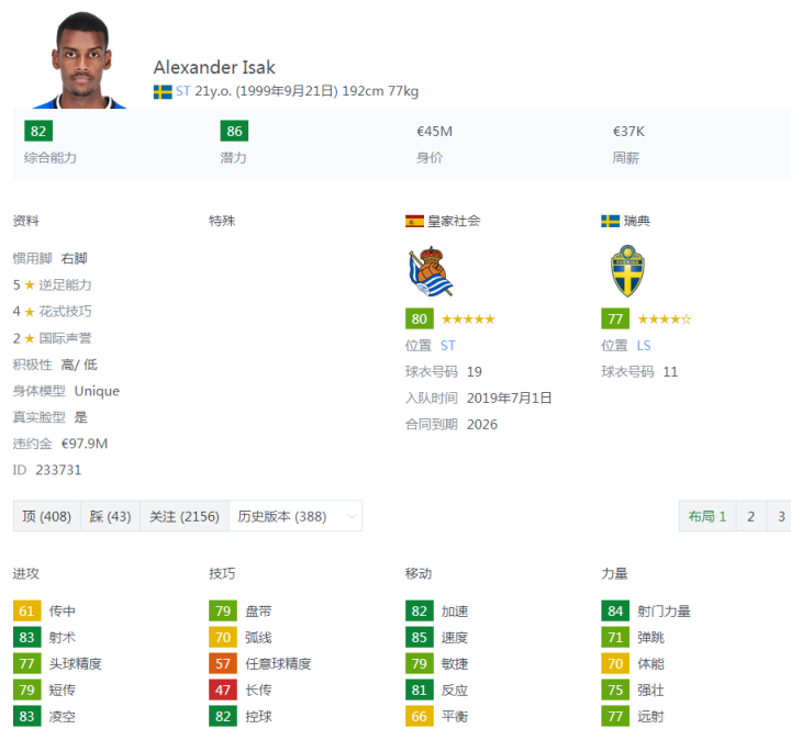 伊萨克能力值82、潜力值86,库卢塞夫斯基能力值81、潜力值89,两人总能力和潜力分别为163和175。