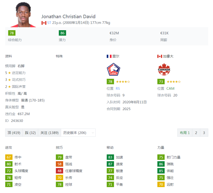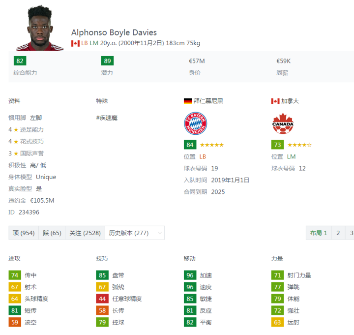 阿方索-戴维斯能力值为82、潜力值为89,乔纳森-戴维能力值为78、潜力值为86,两人总能力和潜力分别为160和175。