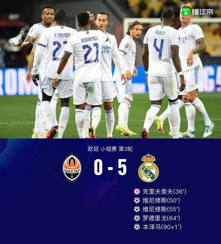 北京时间10月20日03:00,欧冠小组赛D组第3轮展开争夺,皇家马德里客场挑战顿涅茨克矿工。上半场,特鲁宾屡献精彩扑救但难防队友克里夫索夫自摆乌龙。下半场,维尼修斯单刀得手+独闯龙潭破门上演梅开二度后又助攻罗德里戈怒射建功,本泽马策动三粒进球后补时阶段自己反越位扫射也打入一球。最终,皇马火力全开客场5-0狂胜顿涅茨克矿工,报上赛季被双杀之仇。