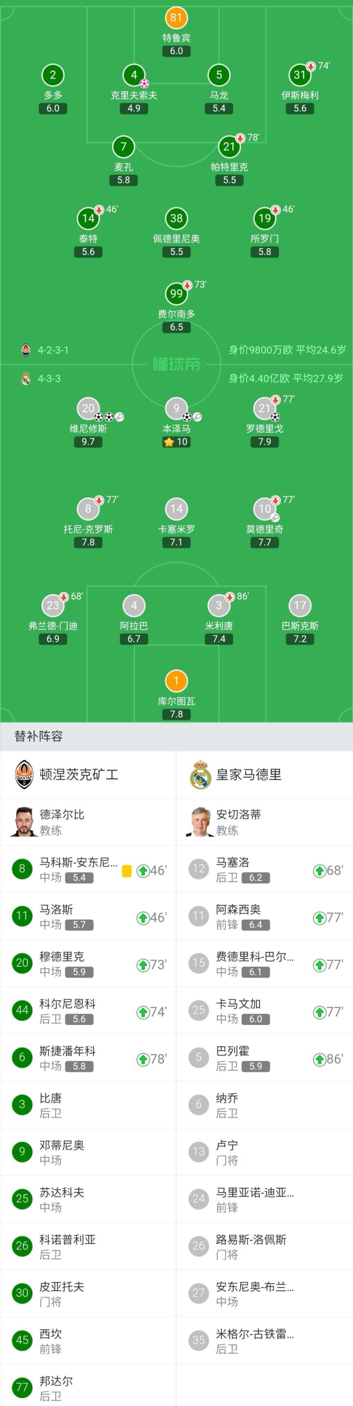 皇家马德里首发:1-库尔图瓦、23-弗兰德-门迪(68'12-马塞洛)、4-阿拉巴、3-米利唐(86'5-巴列霍)、17-巴斯克斯、14-卡塞米罗、8-托尼-克罗斯(77'15-费德里科-巴尔韦德)、10-莫德里奇(77'25-卡马文加)、21-罗德里戈(77'11-阿森西奥)、20-维尼修斯、9-本泽马