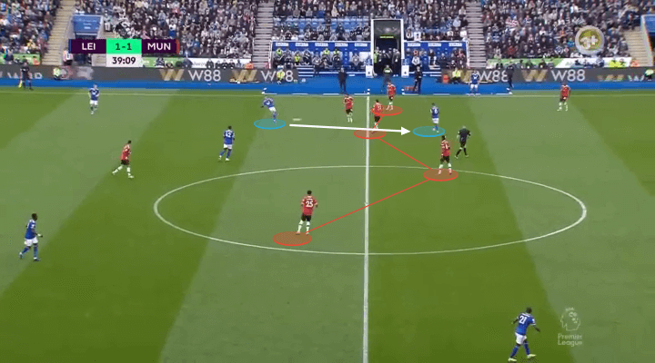 这就意味着,对方球员只要轻松地一个转身,就可以化解这一点的压迫。瑟云聚轻松将球交给了卡斯塔涅,破解了曼联第一道高位防线。