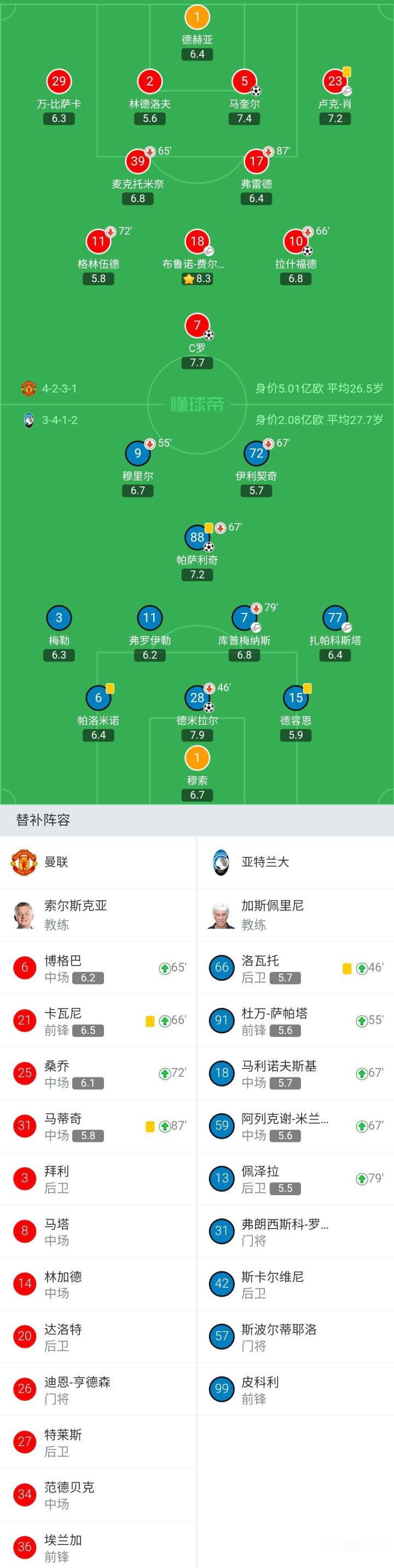 亚特兰大首发:1-穆索、3-梅勒、6-帕洛米诺、7-库普梅纳斯(80'13-佩泽拉)、9-穆里尔(55'91-杜万-萨帕塔)、11-弗罗伊勒、15-德容恩、28-德米拉尔(46'66-洛瓦托)、72-伊利契奇(67'59-阿列克谢-米兰丘克)、77-扎帕科斯塔、88-帕萨利奇(67'18-马利诺夫斯基)