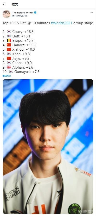峡谷全视野外媒发布英雄联盟S11小组赛前十分钟补刀差TOP10:HLE.Chovy 18.3位列榜首,HLE.Deft 16.1第二。