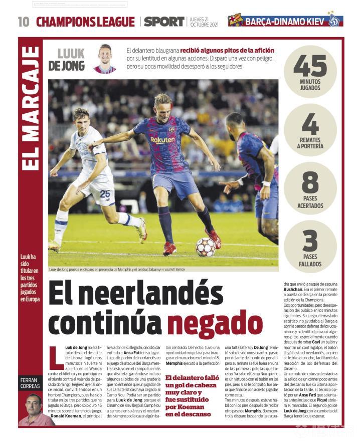 卢克·德容,持续隐身 在昨晚巴萨对阵基辅迪纳摩的比赛中,卢克·德容重回首发,他在本赛季巴萨的三场欧冠比赛中都获得了首发机会。 荷兰中锋在进攻端表现得过于拘谨,跑动太少,甚至受到了看台上主场球迷的嘘声,他们不理解为何像他这样的球员可以登陆诺坎普。这本是一场让卢克·德容大展身手的比赛,他可以充分利用队友的传中创造机会。事实上,在比赛的第18分钟,卢克·德容头球顶偏,错失一次进球的绝佳机会。三分钟后,他的一脚劲射被门将拒之门外。之后,当加维完成抢断传球给卢克·德容后,荷兰前锋的拖沓处理让对方的后卫轻松化解反击。上半场过后,他被科曼换下。 本场比赛,卢克·德容出场45分钟,4次射门,8次传球成功,3次传球失败。 每体速读 第10版