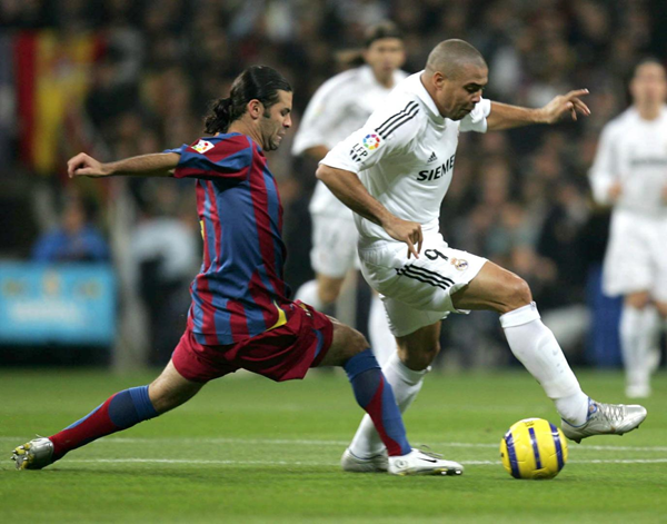 也许是由于天赋异禀,罗纳尔多(Ronaldo Nazario)仍然受到双方球迷的喜爱。1996-97赛季,罗纳尔多以创世界纪录的1950万美元的价格从埃因霍温加盟巴塞罗那。尽管只呆了一个赛季,罗纳尔多却表现得非常出色,在49场比赛中打进47球,帮助巴塞罗那赢得了欧洲优胜者杯、国王杯和西班牙超级杯。但是让红蓝球迷痛心的是,由于合同中的问题,国际米兰满足了他的解约条款,大罗登陆意甲赛场。五年后,罗纳尔多以4600万欧元的价格加盟皇家马德里,与齐达内(Zidane)、贝克汉姆(Beckham)和罗伯托·卡洛斯(Roberto Carlos)组成阵容华丽的银河战舰。尽管与伤病进行反复斗争,大罗在皇家马德里还是取得了巨大的成功,赢得了金球奖、西甲冠军、洲际杯和西班牙超级杯,并在127次出场中打入83球。