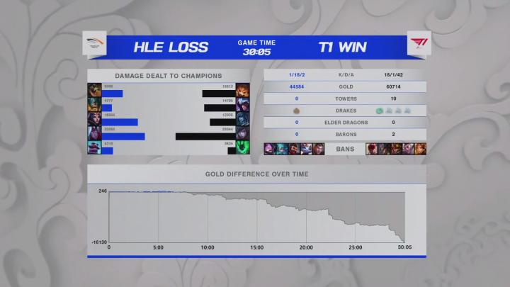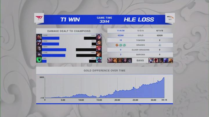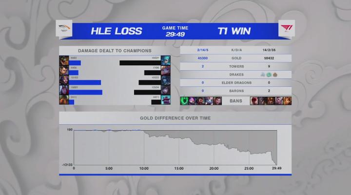 第29分钟,T1先手RUSH掉男爵,击杀男爵的同时冰女进场控住两人,波比跟进控制,T1轻松团灭HLE后赢下比赛,恭喜T1拿到赛点!