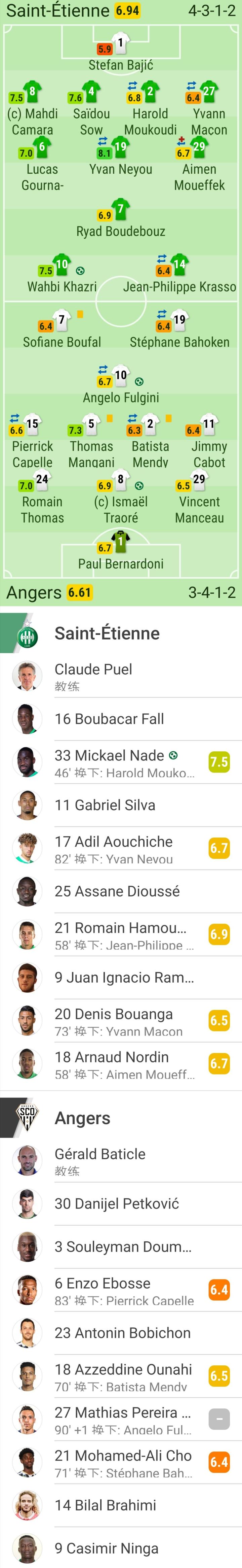 圣埃蒂安首发:1-巴伊奇、8-马赫迪-卡马拉、2-穆库迪(46'33-纳德尔)、4-赛杜-索乌、6-古尔纳-杜瓦斯、27-马松(72'20-布安加)、19-内尤-努帕(81'17-埃德利-奥齐奇)、7-布德布兹、14-克拉索(57'21-哈莫马)、29-穆埃费克(57'18-诺尔丹)、10-哈兹里