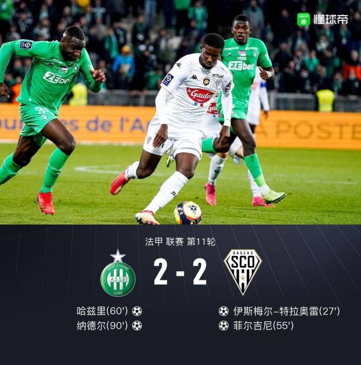 圣埃蒂安2-2昂热一胜难求,纳德尔读秒绝平,哈兹里世界波