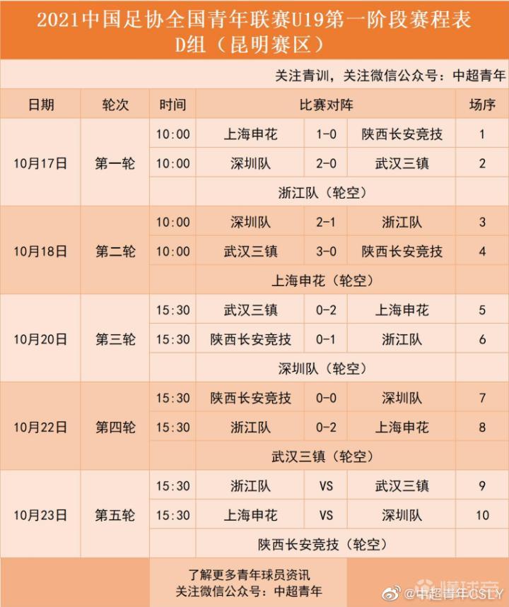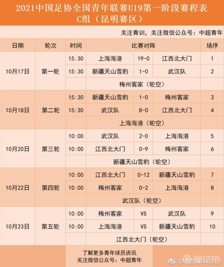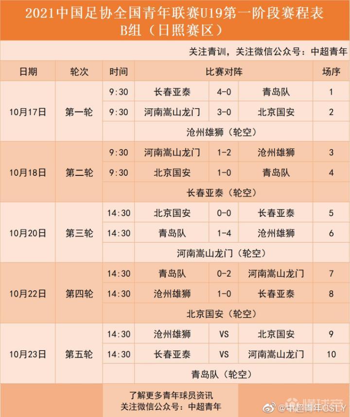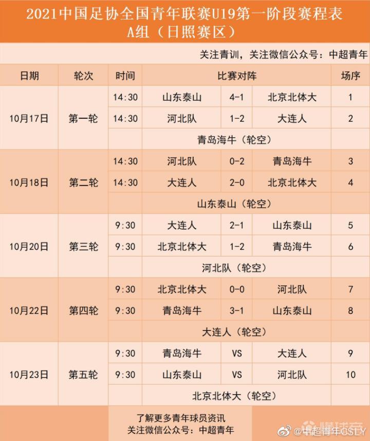 10月22日,2021年中国足协全国青年联赛U19组第一阶段在山东日照与云南昆明两地结束了第四轮的较量。