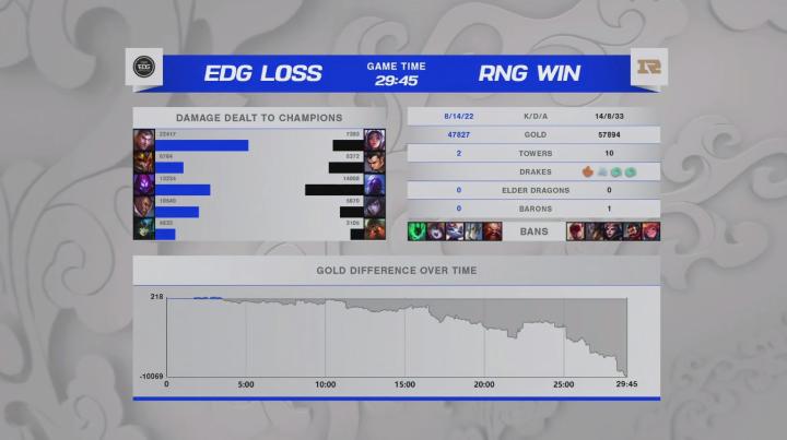 第29分钟,双方集结在远古巨龙处,RNG野辅果断先手秒杀玛尔扎哈,随后瑞兹赶到打出AOE留住多人,RNG一拥而上输出瞬间爆炸秒杀EDG四人,最终RNG推掉EDG基地赢下比赛,恭喜RNG拿下首局!