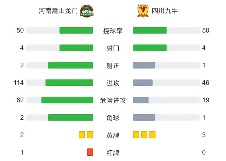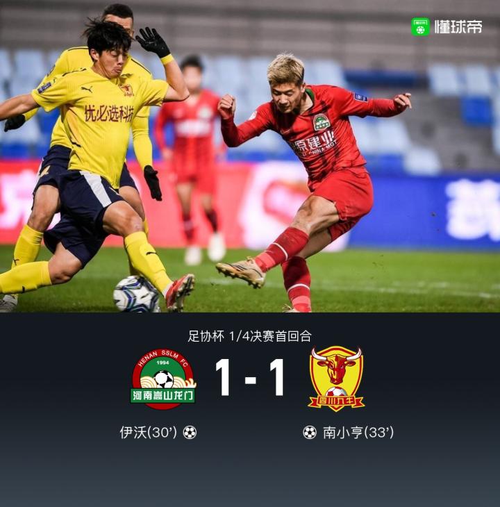 北京时间10月23日19:30,足协杯1/4决赛首回合,河南嵩山龙门对阵四川九牛。上半场,陈蒲转身打门被没收,伊沃抽射破门,南小亨闪电扳平。下半场,卡兰加头球破门被吹越位,张佳祺兜射打偏,卡兰加染红被罚下,最终,河南1-1四川九牛。