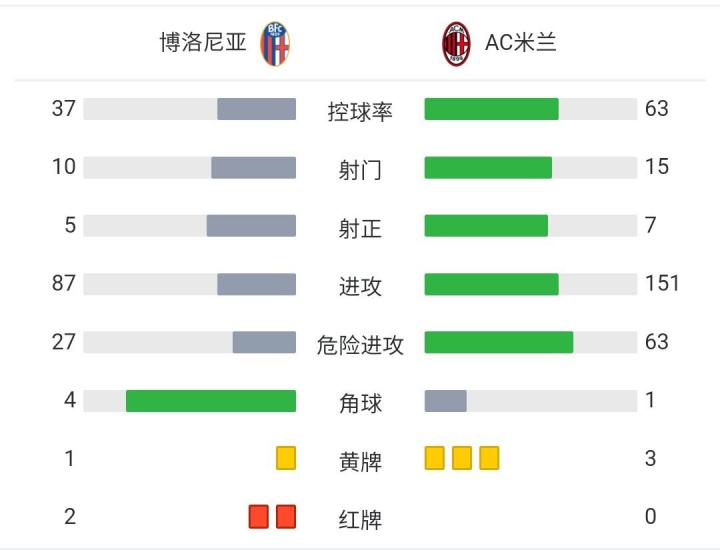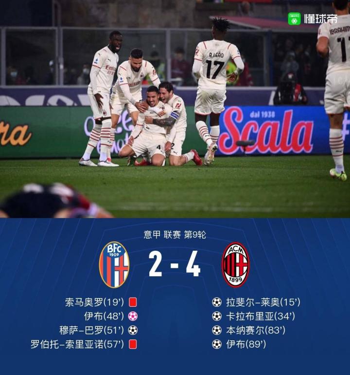 北京时间10月24日02:45,意甲第9轮,AC米兰客场挑战博洛尼亚。上半场莱奥率先小角度破门,随后索马奥罗染红,卡拉布里亚扩大比分;下半场伊布乌龙,巴罗扳平比分,但随后索里亚诺又被红牌罚下,本纳赛尔世界波,伊布再进一球。最终,米兰4-2博洛尼亚。