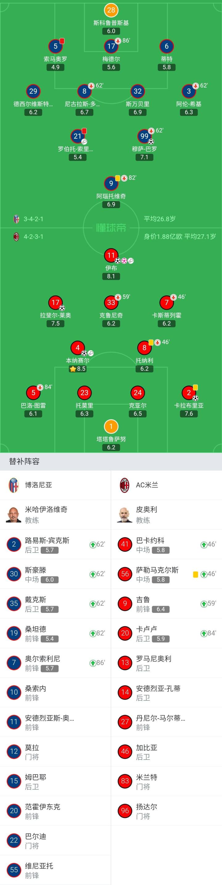 博洛尼亚首发:28-斯科鲁普斯基、5-索马奥罗、17-梅德尔(86'7-奥尔索利尼)、6-蒂特、3-阿伦-希基(63'35-戴克斯)、32-斯万贝里、8-尼古拉斯-多明格斯(63'30-斯豪滕)、29-德西尔维斯特里、21-罗伯托-索里亚诺、99-穆萨-巴罗(63'2-路易斯-宾克斯)、9-阿瑙托维奇(82'19-桑坦德)