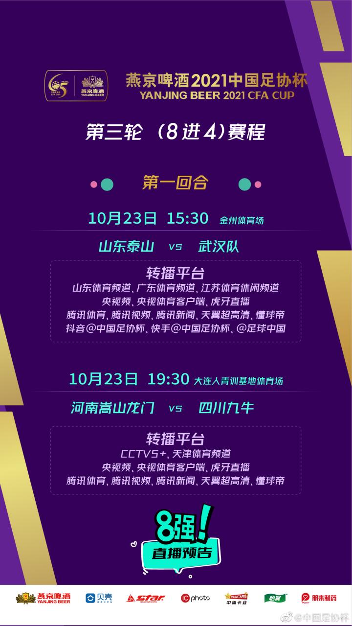 耀武酒肆工作室10月23-24日,燕京啤酒2021中国足协杯1/4决赛首回合,广西球员廖均健、杨超首发登场,全华班出战的武汉队惜败四名外援压阵的山东队,四川九牛顽强逼平中超球队河南嵩山龙门。