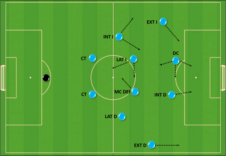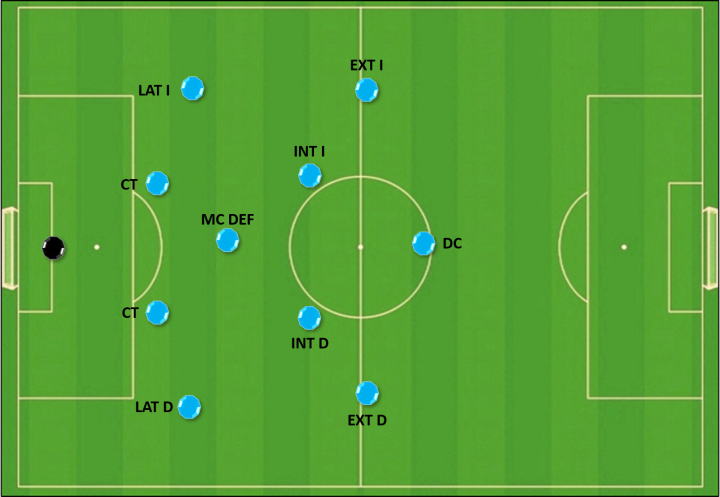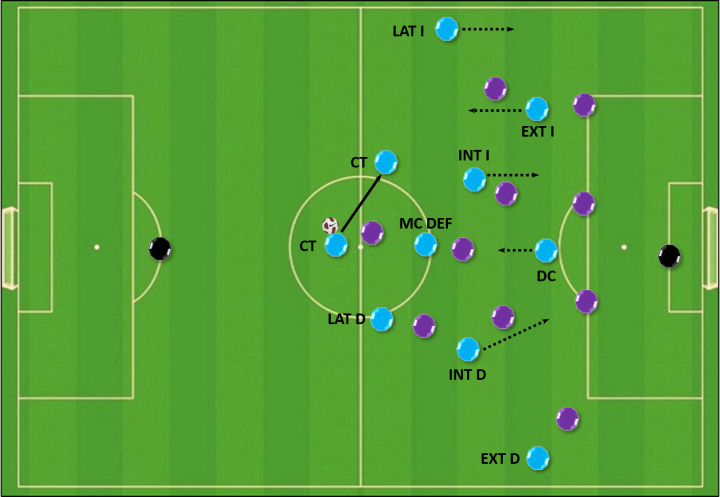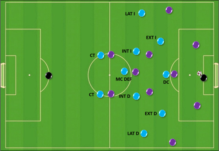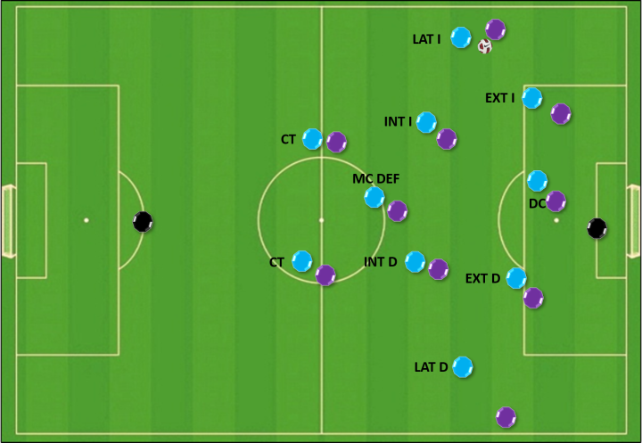 同时,弱侧边后卫同样内收至中路位置,与两名中后卫形成“三后卫”的相对位置关系,同时与身前的边后卫和后腰球员形成中路的“五边形”站位。进攻层面上保证了对于中场空间位置的占据,形成大量出球线路,同时与内收的两名中前卫球员形成纵深的三角位置关系与出球线路; 防守层面上由于两名边后卫没有采用传统的套边战术,事实上后防线4名球员与后腰的位置保证了阵型的整体防守比重并未被削弱。