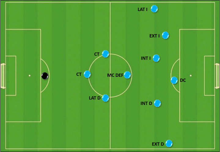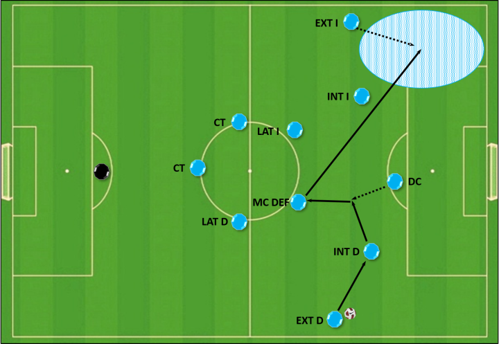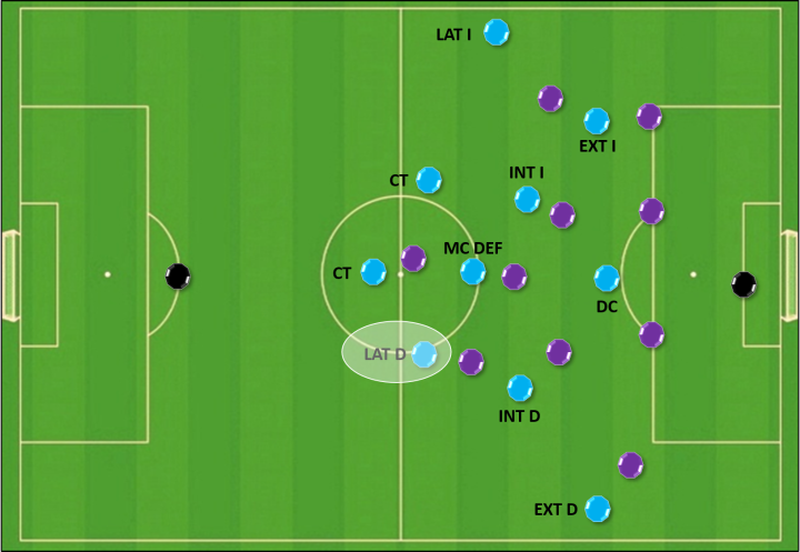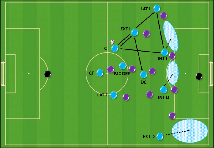 上图可见,当右边锋(EXT D)位置使用顺足(右脚)球员,左边锋(EXT I)使用逆足(右脚)球员,且左边后卫(LAT I)使用进攻属性更强的顺足(左脚)球员时。瓜迪奥拉限制一侧边后卫插上进攻的比重,右边后卫内收至中场位置与两名中后卫以及后腰球员形成中场中路的菱形站位,整体阵型的进攻重心向左侧边路倾斜,右边锋拉边保持进攻阵型整体对于场地宽度的利用,左边锋内收至对方肋部空间同时保持与插上的左边后卫在边路的人数优势与呼应,两名中前卫场上位置整体前压,与后腰以及中锋形成两个三角位置关系,保持中路足够的出球线路,看似中前场的5名参与进攻的球员横向一字排开,并没有很好的利用场地的纵深空间,关于这一问题,我们在下面会有进一步的讲解。
