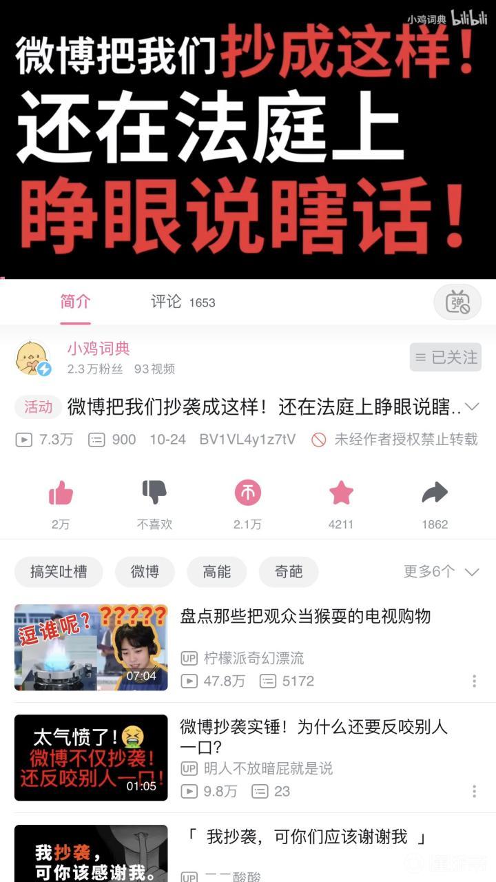 呃…希望大家能关注一下微博抄袭小鸡词典的事件 总结一下就是微博有梗百科(疑似利用爬虫)从小鸡词典内用户编辑的词条(视频内统计共29987条)中抄袭了21278条。通过1.抹除水印(部分抹除的十分明显)2.篡改时间(甚至将时间改动至事件发生前)3.用户造假(将词条平均分给500名用户)【而从百度方面引用的内容(8000多条)则标明了出处】。 微博方面收到起诉及相关证据后,表示小鸡方面有可能篡改微博数据(插入伪造内容)因此拒绝配合调查。 以上内容均来自于小鸡官号在B站发布的视频BV1VL4y1z7tV ps:(小鸡词典:小鸡词典是一款记录、传播网络热点与新兴文化的社区APP,是流行文化百科网站“小鸡词典”对应的APP。—转自百度百科) pss:原视频已经疑似被叔叔限流了(3.5:1的点赞比属实有点离谱了) psss:转载已获得视频作者认可,官方表示希望大家多多扩散,相信法律,不要有过激行为。 pssss:第一次搬运,希望逻辑还顺畅