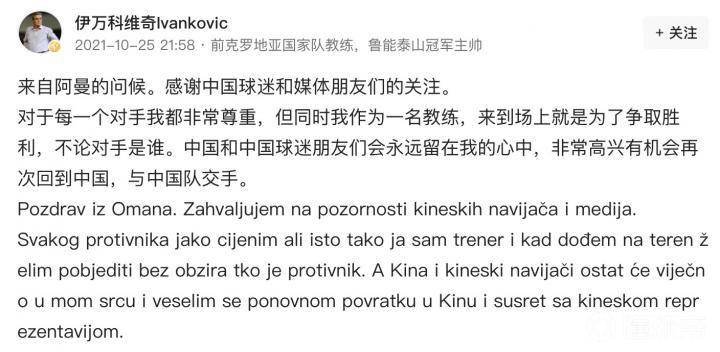 并且伊万科维奇本人很快在今日头条用中克双语发布了动态,可以说态度谦和、措辞得当,既表达了要争取胜利的意思,也表达了对比赛对手的尊重,还回顾与中国足球的旧感情。这才是符合伊万儒帅人设的表达。