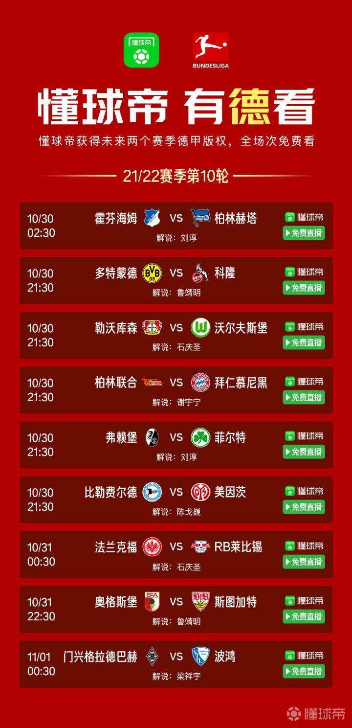 北京时间今晚及明天凌晨,五大联赛将继续进行多场比赛。懂球帝将继续为大家带来德甲联赛全场次视频直播,@谢宇宁 、@鲁靖明 、@足球解说-石庆圣 、@足球解说员刘淳 、陈戈巍将在21:30分别对柏林联合vs拜仁慕尼黑、多特蒙德vs科隆、勒沃库森vs沃尔夫斯堡、弗赖堡vs菲尔特、比勒费尔德vs美因茨进行解说评述,@足球解说-石庆圣 还将在凌晨00:30带来法兰克福vs莱比锡的解说评述。