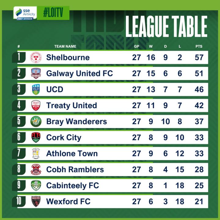 戈尔韦联,都柏林大学,特雷蒂联(条约联),布雷流浪分列2-5名,这四队将角逐出一个名额和爱超第九名进行升降级附加赛。