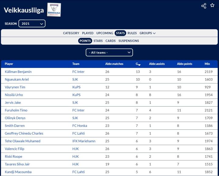 射手榜方面,国际图尔库的芬兰前锋凯尔曼(Benjamin Källman)以13球位居射手榜首位,领先第二名,塞伊奈约基的喀麦隆前锋恩格乌坎(Ariel Ngueukam)3球,而恩格乌坎打入10球。古比斯的芬兰前锋韦于吕宁(Tim Väyrynen)暂时以9球位居第三,注意到他只出场了12场总计929分钟,可以说他的效率是非常高的,如果他能够多出场的话,有可能现在位居射手榜首位的就是他了。