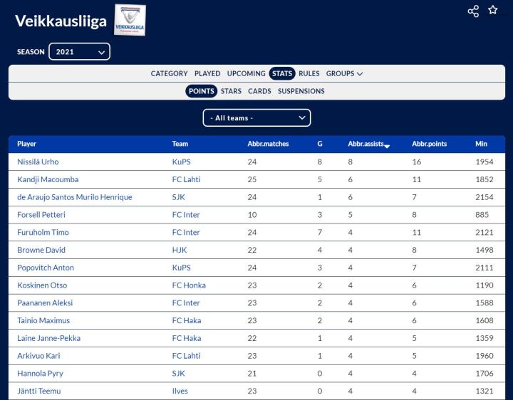 助攻榜方面,古比斯的芬兰中场尼西拉(Urho Nissilä)以8次助攻暂时位居助攻榜首位,值得一提的是,他已经打进了8个进球,直接制造了16个进球,在直接制造进球方面暂时和凯尔曼一起并列第一。拉赫蒂的冈比亚前锋坎吉(Macoumba Kandji)以6次助攻和塞伊奈约基的巴西左后卫穆里洛暂时并列第二。图尔库国际的芬兰中场福塞尔(Petteri Forsell)以5次助攻暂时位列第四,不过他仅仅出场了10场885分钟,如果他能够有更多的出场时间,可能现在位居助攻榜头名的就是他了。