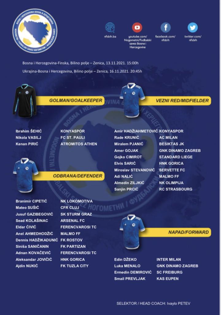 波斯尼亚和黑塞哥维那国家队将于11月8日在Ilidža的奥地利波斯尼亚酒店集合。与芬兰和乌克兰的比赛定于11月13日和16日在泽尼察的“比利诺-波列”球场举行。