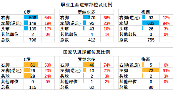C罗梅西大罗生涯进球部位比:C罗全能大罗无逆足梅西金左脚