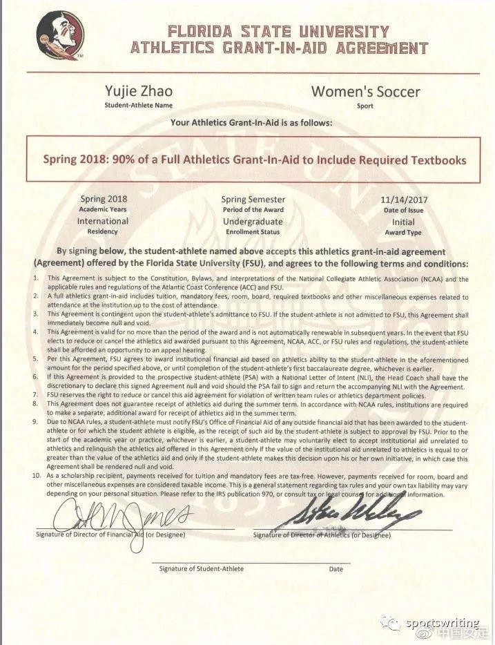 回国后,赵瑜洁准备了自己的英文简历和踢球的视频集锦,给四所不同的美国大学写了颇有针对性的申请信。四所学校都给了回复,有的大学因为经费问题,不能给出奖学金,而佛罗里达州立大学,则是自始至终对赵瑜洁保持最大兴趣的。
