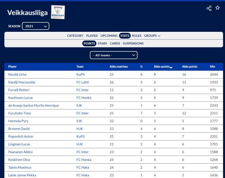 助攻榜方面,古比斯的芬兰中场尼西拉以8次助攻成为本赛季芬超的助攻王,以及本土助攻王。而拉赫蒂的冈比亚前锋坎吉、图尔库国际的芬兰中场P·福塞尔、汉卡的巴西中场卢卡斯·考夫曼、塞伊奈约基的巴西左后卫穆里略四人都送出了6次助攻。