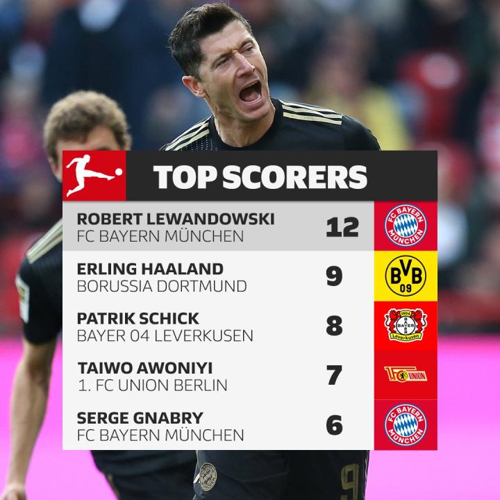 德甲联赛第十轮的比赛已经全部结束,德甲射手榜上的形势没有出现太大的变化,本轮拜仁在客场5-2击败柏林联合,梅开二度的莱万将个人赛季进球数提升到12球,领先第二的哈兰德3球。