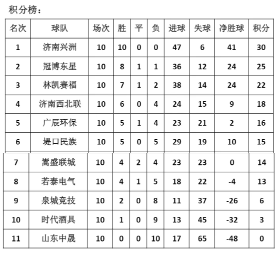 潇栋-2021年8月21日,2021山东省业余足球甲级联赛(济南赛区)暨“荷花杯”济南市足球协会超级联赛,在历城区朱家庄足球场落幕。济南兴州足球俱乐部蝉联冠军,冠博东星足球俱乐部获得亚军,林凯赛福足球俱乐部位列季军,获得历史最好成绩。济南西北联、广辰环保、堤口民族、嵩盛联城、若泰电气、泉城竞技、时代酒具、山东中晟分列4-11名。山东广辰环保足球俱乐部以良好的赛风赛纪荣获精神文明奖。