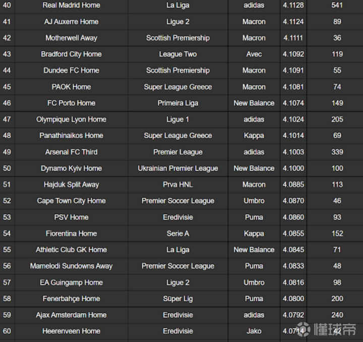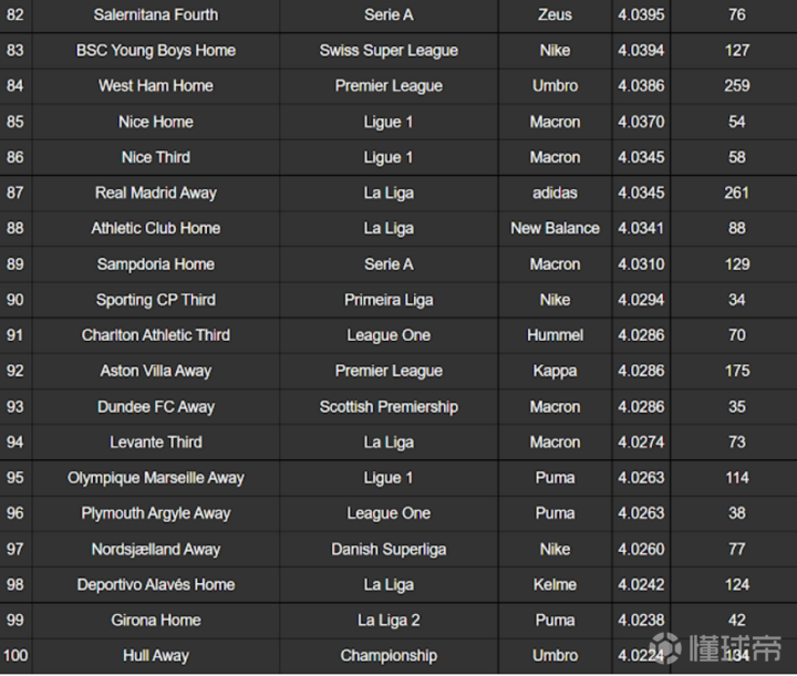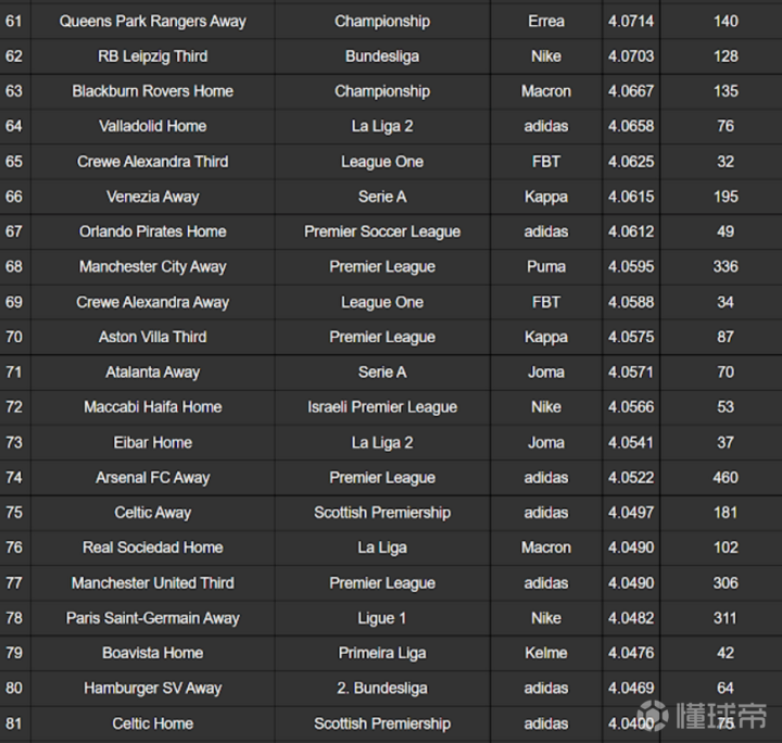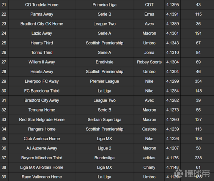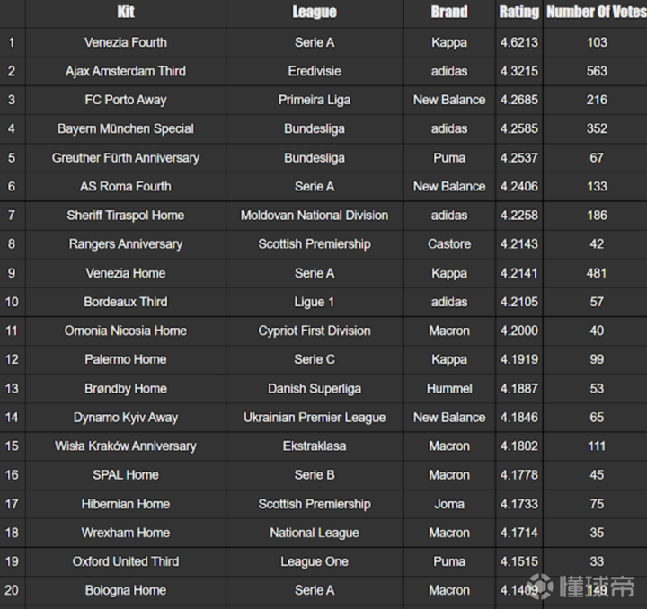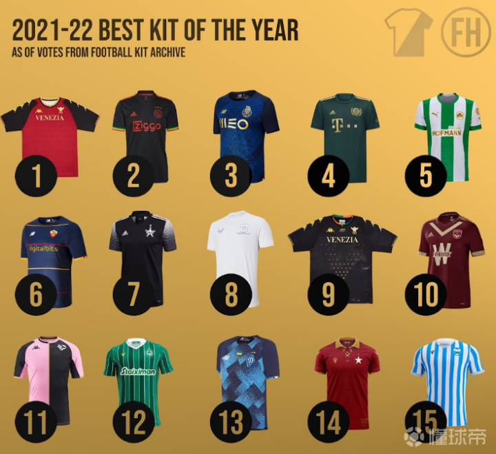 由Football Kit Archive评选的2021-22 赛季最受欢迎的100件球衣排名揭晓,2021-22 赛季最佳球衣是威尼斯 21-22 第四球衣,平均评分为 4.6(满分 5)。阿贾克斯 21-22 的第三球衣排名第二(4.3),其次是波尔图(4.3)。 在排名靠前的有一件模板球衣,蒂拉斯波尔特警长主场球衣在排名中排名第七(4.2)。这当然是因为这支球队令人难以置信的欧冠表现。 另一个有趣的是,前 15 名中没有任何耐克球衣 - 评分最高的耐克球衣是利物浦的客场球衣(排名 #29 - 4.1)。