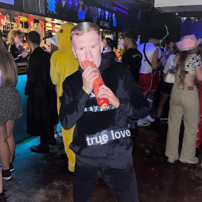 一位球迷在社交媒体上晒出了自己在万圣节派对上的变装照。从照片中可以看出这名球迷戴上了斯科尔斯的面具,手里抱着一只红色的假腿,而脚趾部位就放在斯科尔斯面具的嘴上。