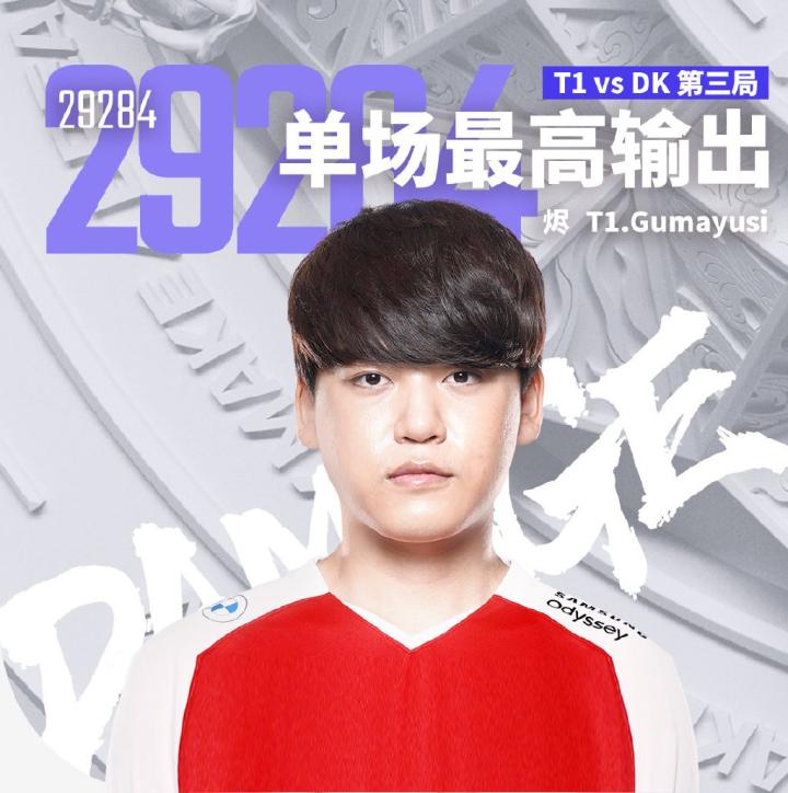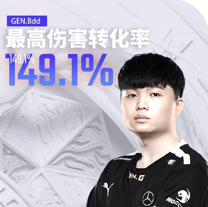 KDA之王则来自DK中单ShowMaker,高达8.3。T1的ADC选手Gumayusi使用烬在对阵DK的第三局打出29284的单局最高输出。最高伤害转化率来自GEN中单Bdd,高达149.1%。(来源:玩加电竞)